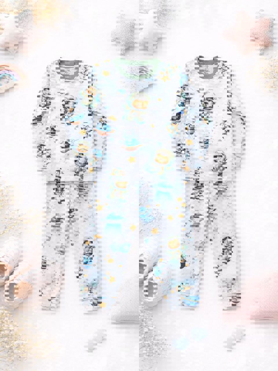 طراحی فانتزی با طرح فضانورد و سیارات، حس ماجراجویی و شادی را به استایل کودک میبخشد و برای استفاده روزمره، مهمانی یا منزل کاملاً مناسب است.