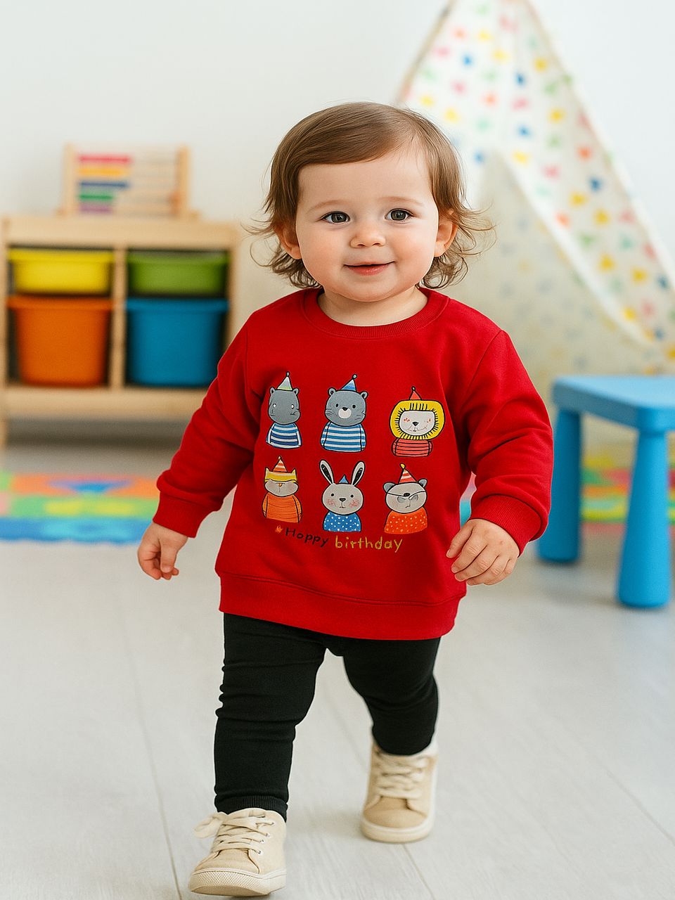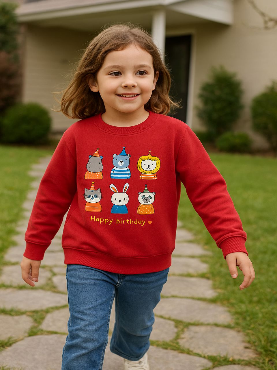 این دورس بچگانه قرمز با طراحی جذاب حیوانات کارتونی و عبارت Happy Birthday گزینهای عالی برای استایل روزمره و جشن تولد کودکان است.